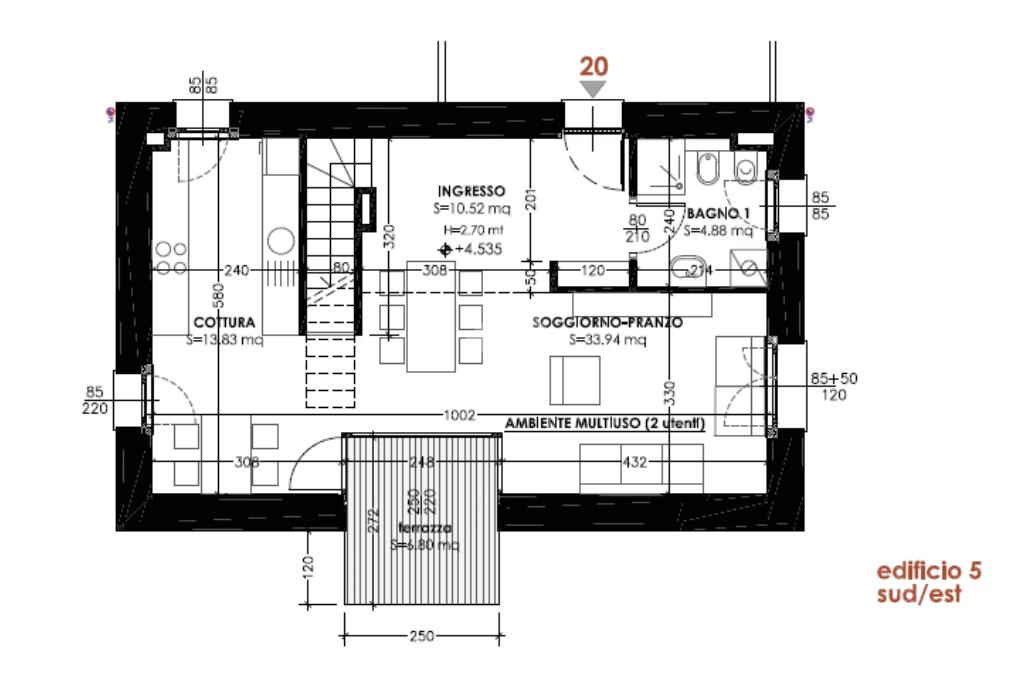 L’ingresso si apre sulla luminosa zona giorno, composta da un ampio soggiorno con accesso diretto al terrazzo abitabile, una cucina separata e un bagno finestrato. Una scala interna conduce al piano superiore dove si trovano due camere da letto, entrambe con uscita sul balcone, e un secondo bagno.