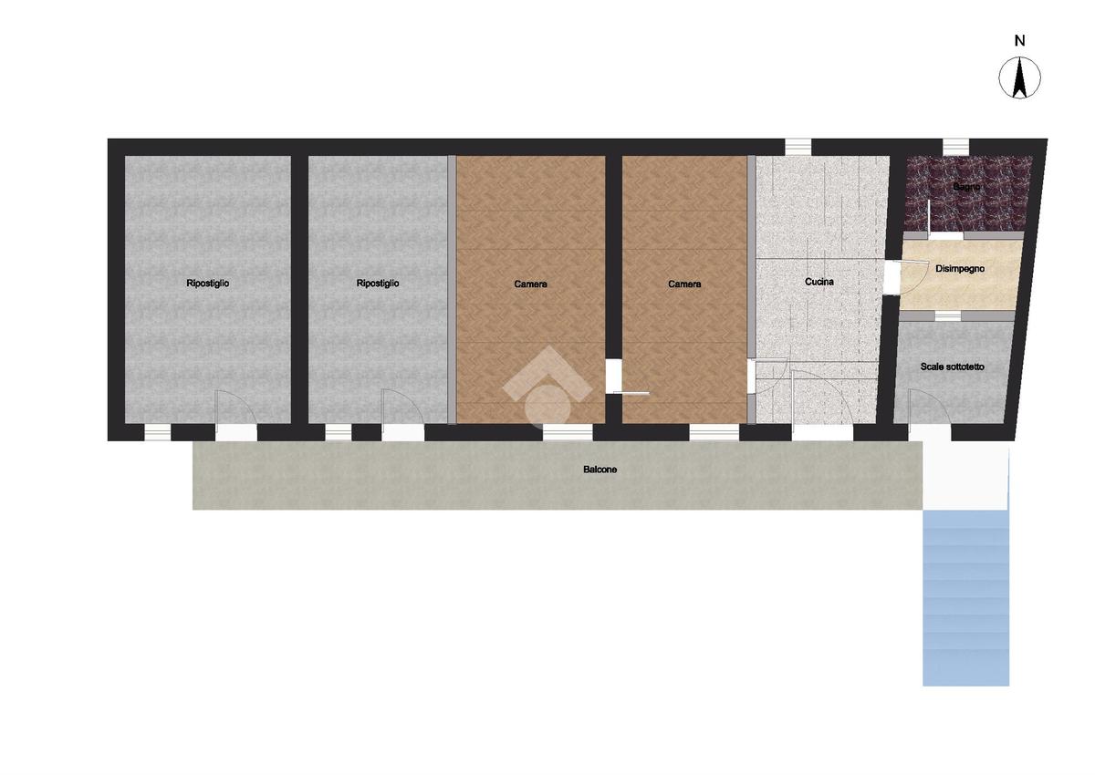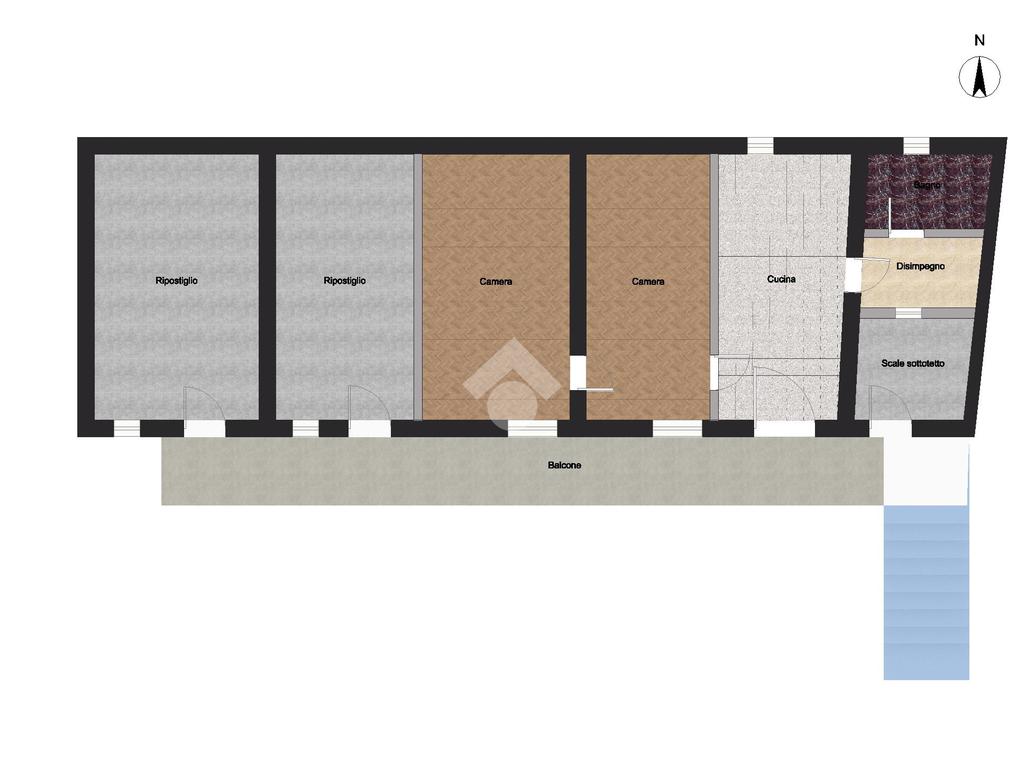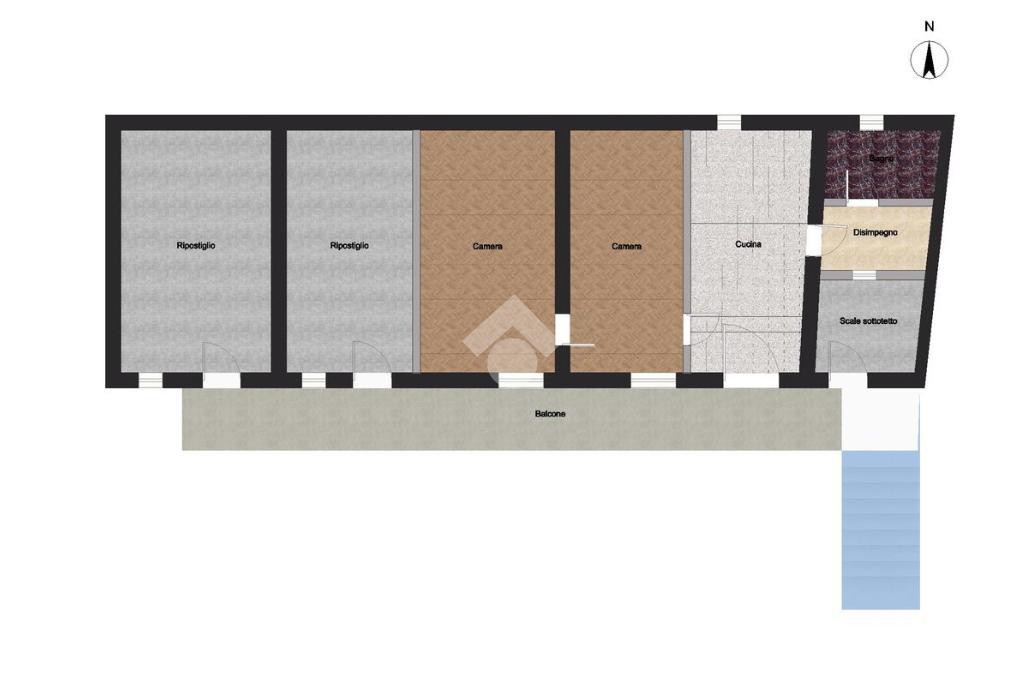 L’accesso all’immobile avviene tramite una scala esterna che conduce a un ampio balcone d’ingresso. La soluzione si apre sulla zona giorno, proseguendo troviamo la zona notte composta da due camere da letto, un bagno finestrato con vasca e un pratico locale adibito a ripostiglio/lavanderia.