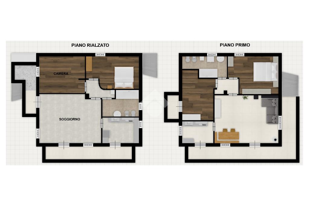 La distribuzione interna dei due alloggi è la medesima e si presenta armoniosa e razionale: ogni appartamento dispone di una cucina separata, di un soggiorno ampio e accogliente che si affaccia su un balcone vivibile e di due camere da letto. Il bagno, finestrato e dotato di vasca, completa la zona notte con comfort e praticità.